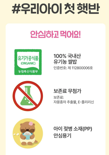 첨가물 없이 순도 100% 국내산 유기농쌀로만 지어진 밥, 아이 입맛에 맞춘 130g 소용량, 그리고 아이가 스스로 먹기 좋은 안심용기까지 갖춘 제품이라면 어떨까요?