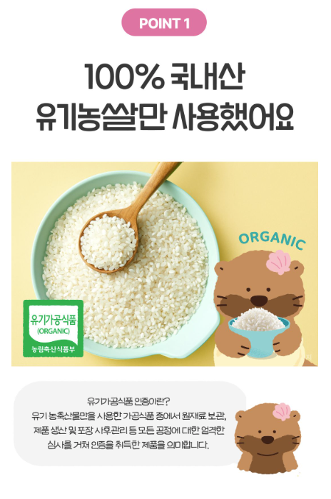아이 한 끼를 책임지는 제품이기에, 쌀의 품질부터 남다르게 신경 쓴 것이 느껴지는 부분이에요.