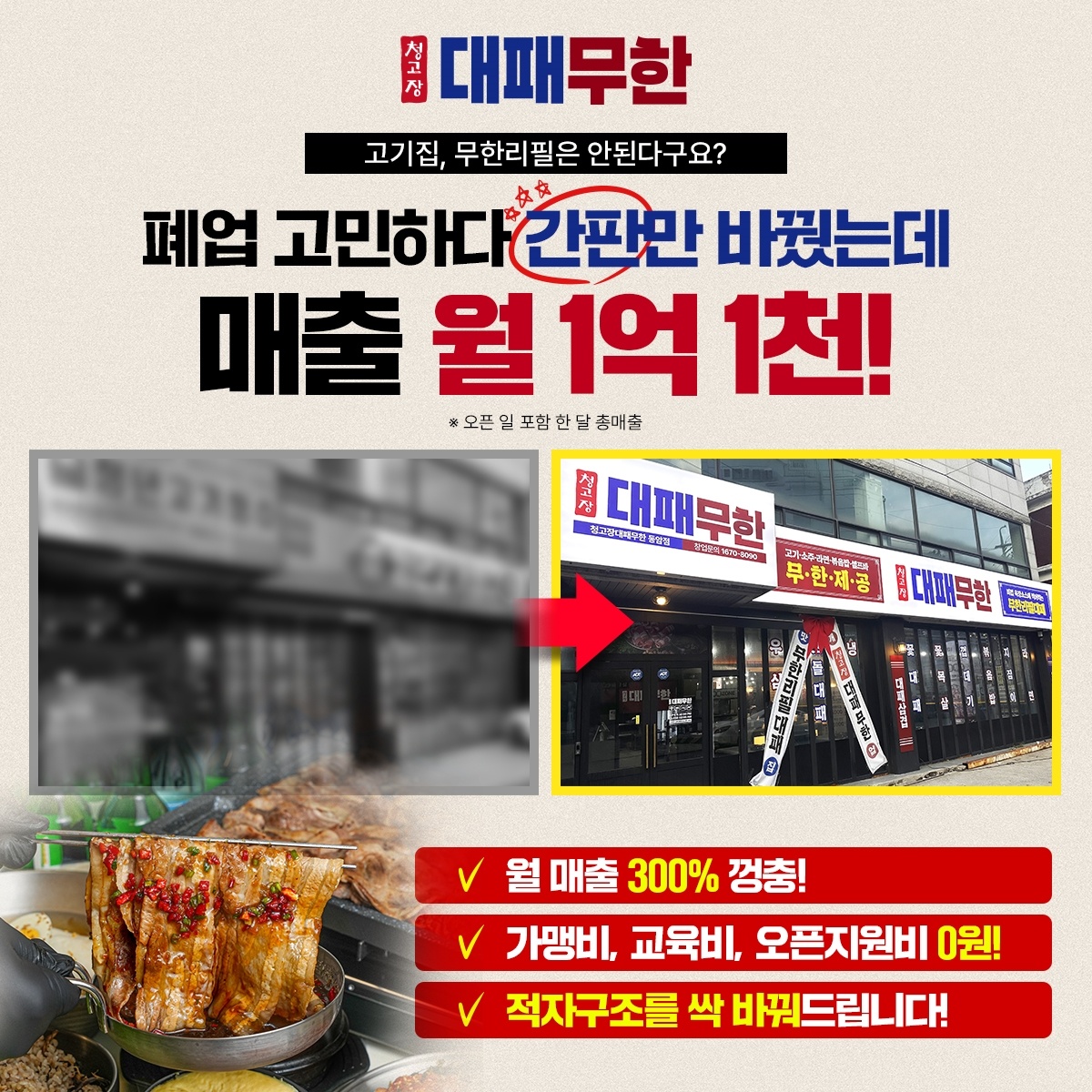 폐업도 힘들다면, 청고장대패무한 창업이 정답! 간판만 변경하고 "0원 창업!“ 창업상담 시 상당한 추가 혜택까지! 간판변경으로 0원 창업가능 사장님 마음대로 자율시공으로 추가 비용 절감 기
