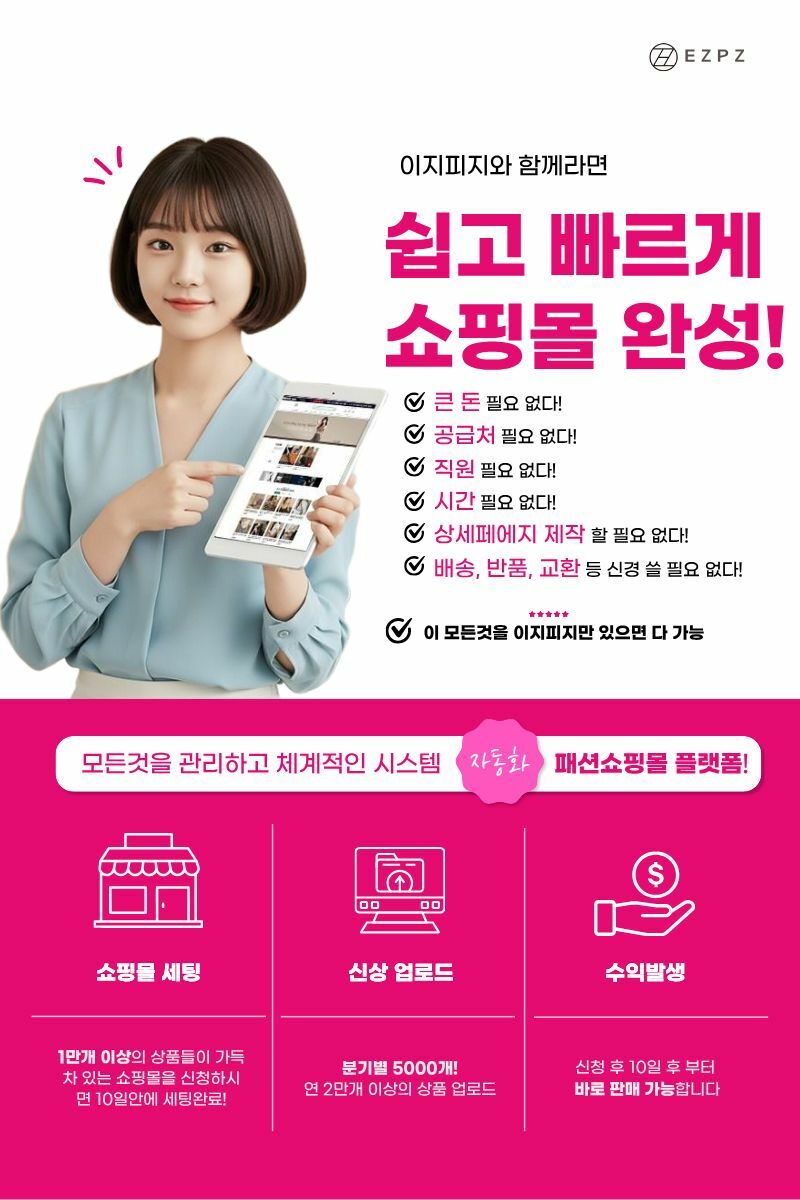 ◀소 개▶ EZPZ(이지피지)는 누구나 쉽게 나만의 쇼핑몰을 운영할 수 있는 자동화 플랫폼입니다. 클릭 몇 번으로 온라인 쇼핑몰을 시작하고, 운영할 수 있게 돕는 클라우드 기반 플랫폼입니다. 즉