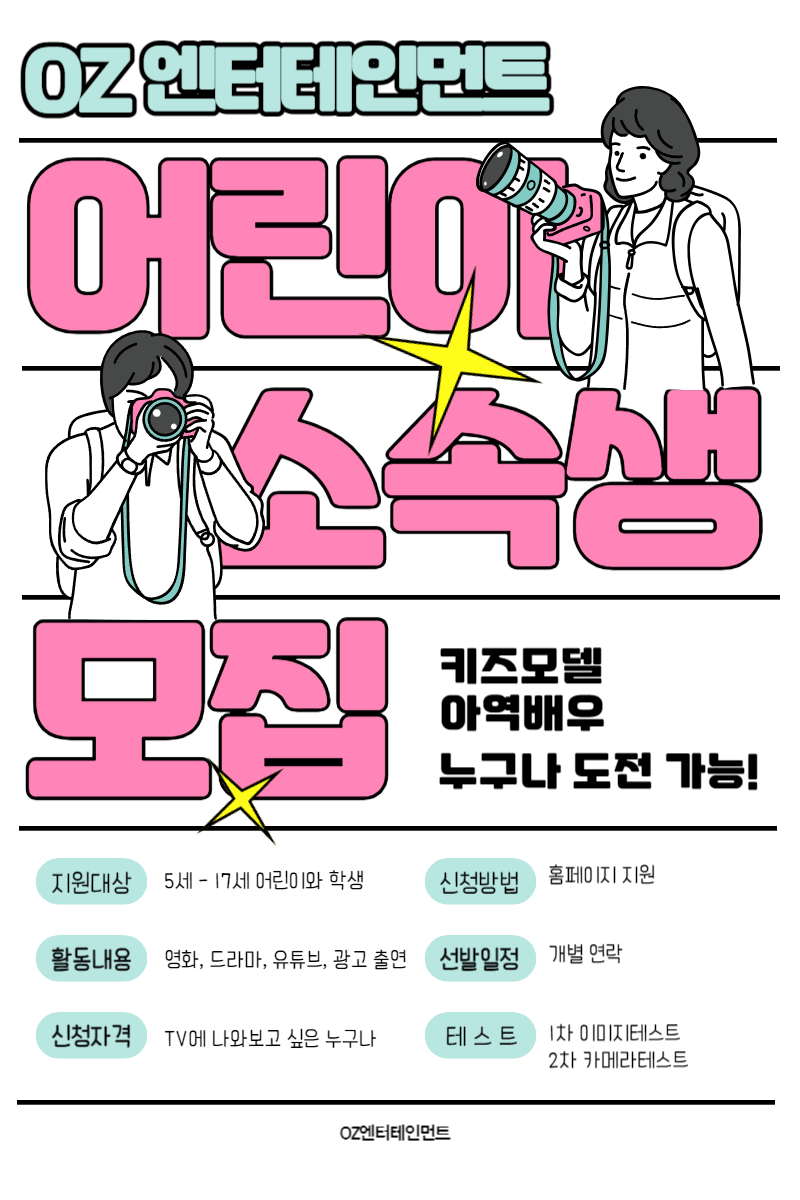 오즈엔터테인먼트는 방송사, 제작사와 직접 연결하여 폭 넓은 문화 콘텐츠와 방송 관련 캐스팅 지원함으로 직접적인 현장 경험이 가능하며, 경험이 없는 아이들도 원활하게 출연 지원을 하고있